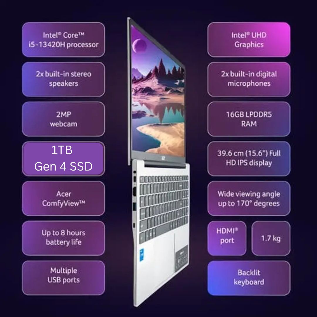 The Acer Aspire Lite AL15-52H with Intel® Core™ i5-13420H processor is the perfect blend of speed and style. Whether you're a student, professional, or casual user, the 16GB LPDDR5 RAM and 512 GB SSD ensure fast performance and storage space for all your files. The crisp 15.6-inch FHD IPS display paired with Intel® UHD Graphics offers a smooth viewing experience. With a sleek Pure Silver design and essential productivity tools like Windows 11 + MSO, this laptop delivers premium value at an affordable price.
