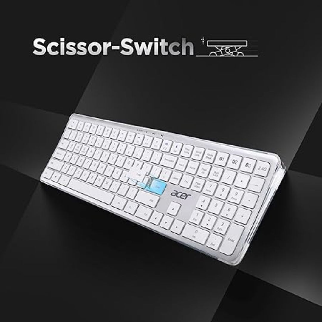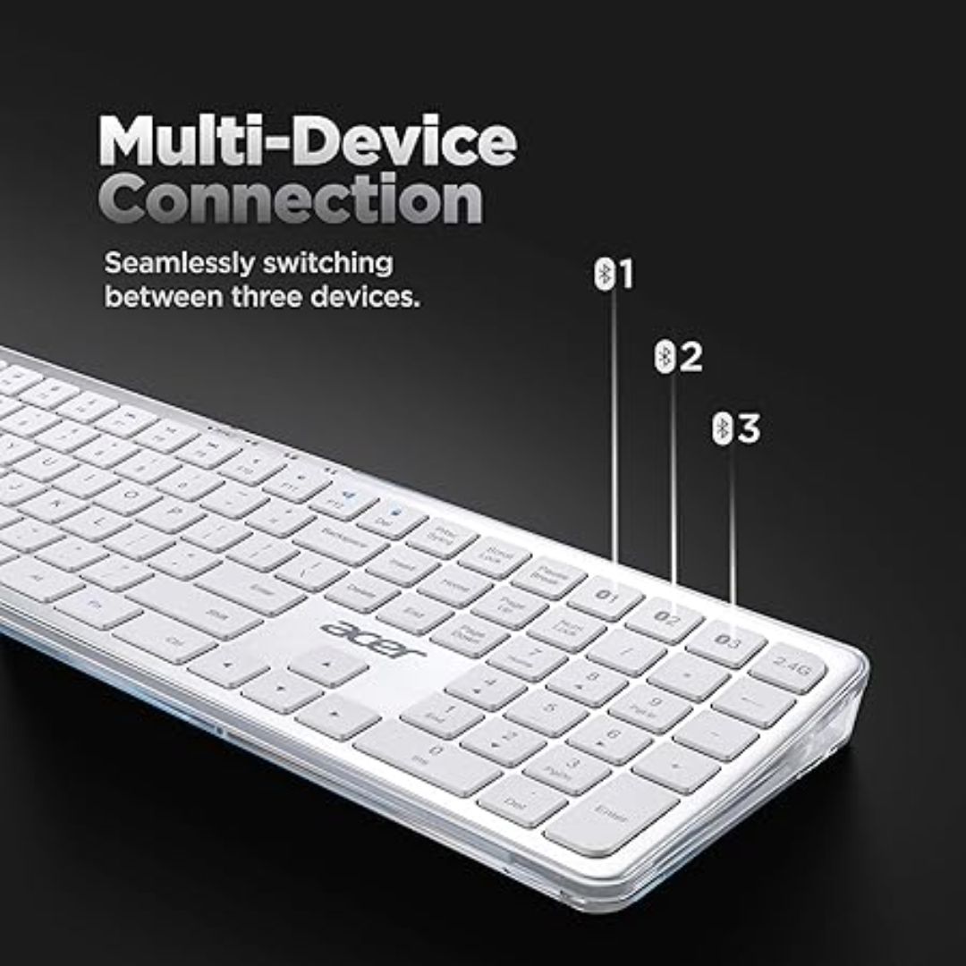 The Acer Clearview Curved Transparent Wireless Keyboard is a stylish and versatile productivity accessory, designed for multi-device users who need seamless connectivity. With dual connection modes (Bluetooth and 2.4GHz wireless), it allows you to switch easily between laptops, tablets, and smartphones.