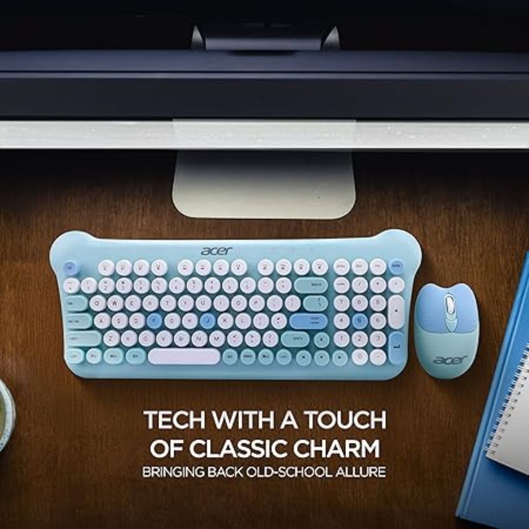 The Acer CUTEO 2.4GHz Wireless Keyboard & Mouse Combo combines retro style with modern wireless technology. Featuring round typewriter-style keys and a compact 98-key layout, it offers a comfortable and stylish typing experience.