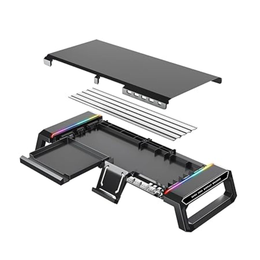 Equipped with RGB ambient lighting, it adds a modern aesthetic touch to your desk, while the integrated 4-Port USB hub keeps your peripherals connected with ease. Built from premium aluminum, the stand ensures durability and stability, making it suitable for both lightweight laptops and heavier monitors.