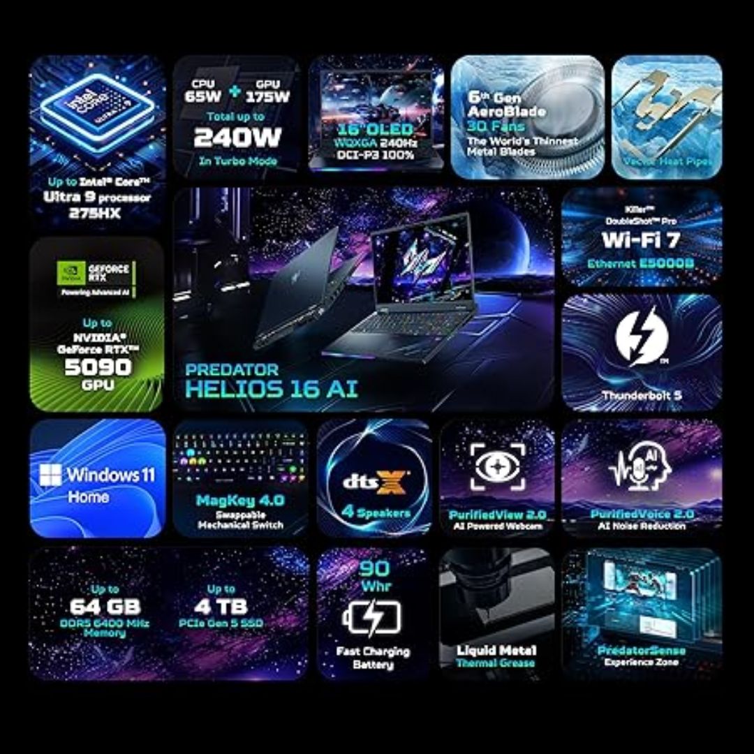 Acer Predator Helios 16 AI (PH16-73) redefines premium gaming with raw power, advanced AI processing, and stunning visuals. Equipped with the Intel Core Ultra 9 275HX processor and NVIDIA GeForce RTX 5090 (24GB GDDR7), it delivers next-level performance for gaming, 3D rendering, and AI-driven workloads. Its 16” WQXGA OLED display with 240Hz refresh rate ensures ultra-fluid motion and vibrant colors. With 32GB DDR5 RAM and 2TB SSD, multitasking and loading times are effortless. The Abyssal Black design, RGB keyboard, and Predator cooling technology make this a dream machine for serious gamers and creators alike.