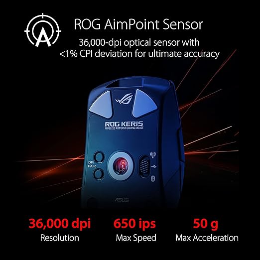 The ROG Keris Wireless AimPoint lightweight 75-gram wireless RGB gaming mouse features a 36,000 dpi ROG AimPoint optical sensor, tri-mode connectivity, ROG SpeedNova wireless technology, swappable mouse switches, ROG Micro Switches, PBT buttons, ROG Paracord, 100% PTFE mouse feet, five programmable buttons, ROG mouse grip tape.