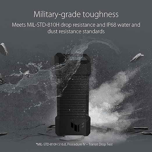 USB-C 3.2 Gen 2x1 SSD enclosure, Supports both M.2 NVMe PCIe or SATA interfaces, M.2 Q-Latch for easy installation, MIL-STD-810H drop resistance, IP68 water and dust resistance, PS5 and Xbox support