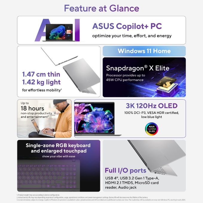 The ASUS Vivobook S 15 OLED (2024), , is an advanced AI Powered Copilot+ PC built on the Qualcomm Snapdragon X Elite processor. Designed for the future of computing, this laptop delivers seamless AI acceleration, optimized performance, and efficient multitasking capabilities.