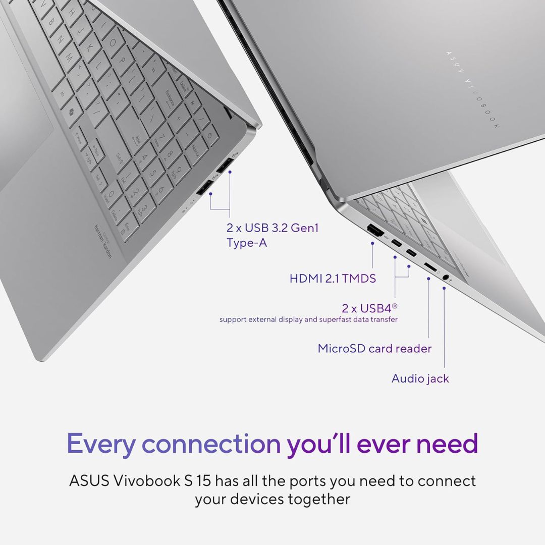 Weighing just 1.42 kg and featuring a premium Cool Silver design, it’s built for portability without compromise. The backlit keyboard ensures productivity anywhere, while the large 70WHrs battery keeps you powered throughout the day. Pre-loaded with Windows 11 Home and Office 2021, the Vivobook S15 is your perfect AI-powered companion for work, creativity, and entertainment.