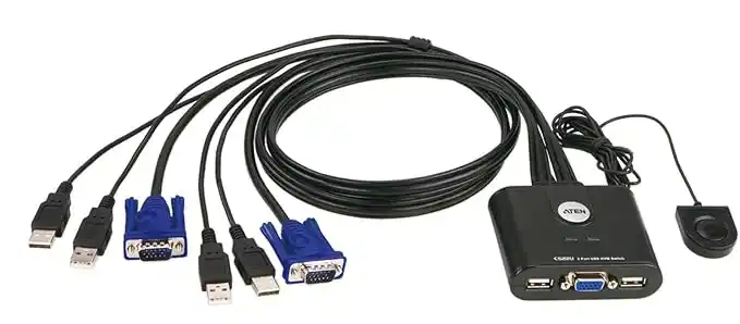 The compact CS22U allows quick switching between 2 VGA-interfaced PCs via one KVM console and flexible media sharing via the console USB ports, which helps to expand desktop workspace while keeping it tidy and organized for improved productivity.