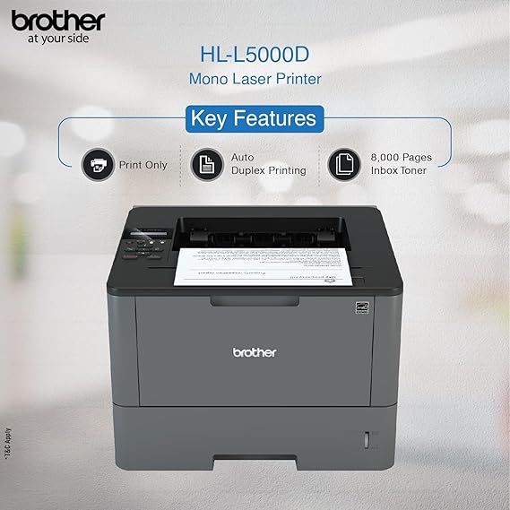 The Brother HL-L5000D monochrome laser printer is ideal for offices that need a printer with a Parallel interface for wide application compatibility. It features reliable, fast printing up to 40ppm and cost-efficient output thanks to a high-yield replacement toner cartridge. Plus, automatic two-sided printing helps save paper. Use the 250-sheet capacity paper tray for letter or legal-size documents, and print on envelopes and alternative media types from the 50-sheet capacity multi-purpose tray.