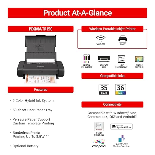 The Canon Pixma TR150 is a lightweight, portable inkjet printer with WiFi and USB connectivity, and an optional battery operation. It has a 50-sheet input capacity and consumes 8W while printing and 1.1W in standby mode. Weighing just 2.1 kg (2.3 kg with battery), it uses Pigment Black and Dye-based color inks (C/M/Y/Bk). Its compact dimensions are 322×185×66 mm, making it easy to carry for on-the-go printing.