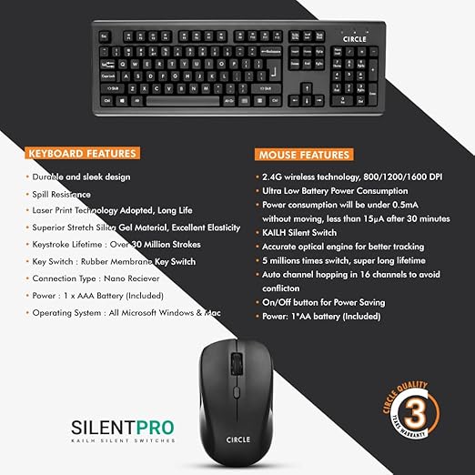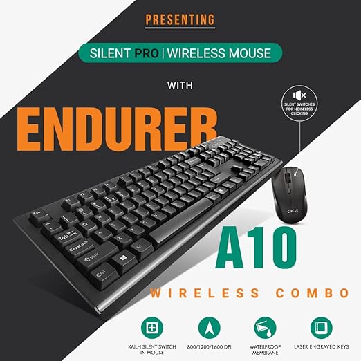 Circle Endurer A10 Wireless Keyboard and Silent Pro Mouse Combo, designed for smooth, quiet, and efficient performance. This sleek and modern set features a spill-resistant keyboard with a slim, compact design, making it perfect for both home and office setups. The UV-printed keycaps ensure long-lasting visibility, while the ergonomic layout offers comfortable typing even during extended use.