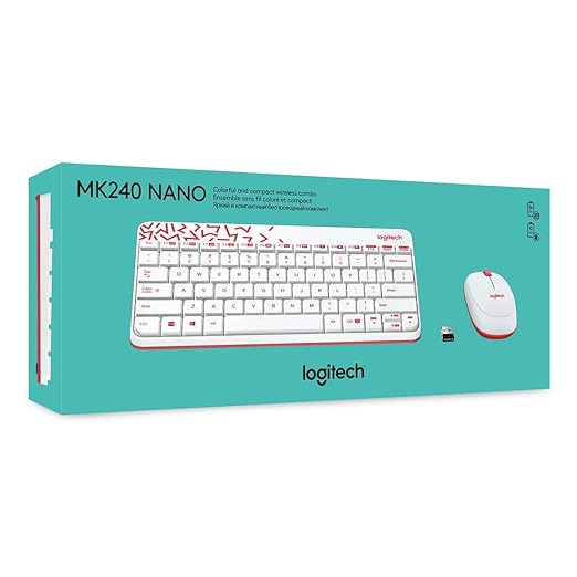 Logitech MK240 Nano combo features a compact design, long battery life, spill-resistant keys, and a sleek white and red color scheme (perfect for PCs and Macs).