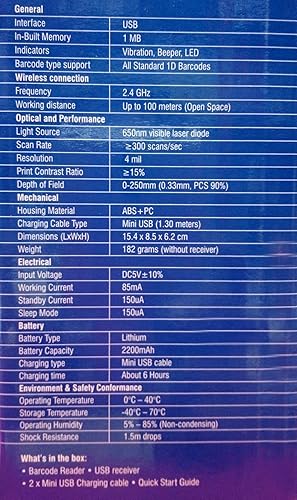 | Included Components | 1 Barcode Reader, USB Receiver, Mini USB charging cable |