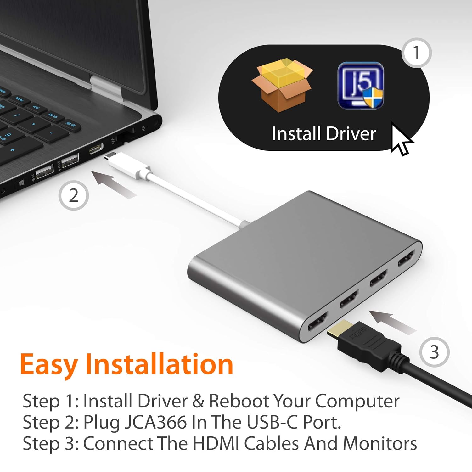 j5create JCA366 is a USB-C to Quad HDMI adapter. It supports connection with 4 displays simultaneously at 1080p 60hz. Supports multiple display modes to better suit your workflow. The converter requires no external power, just plug in your type-c devices and start using. Here are the key features: