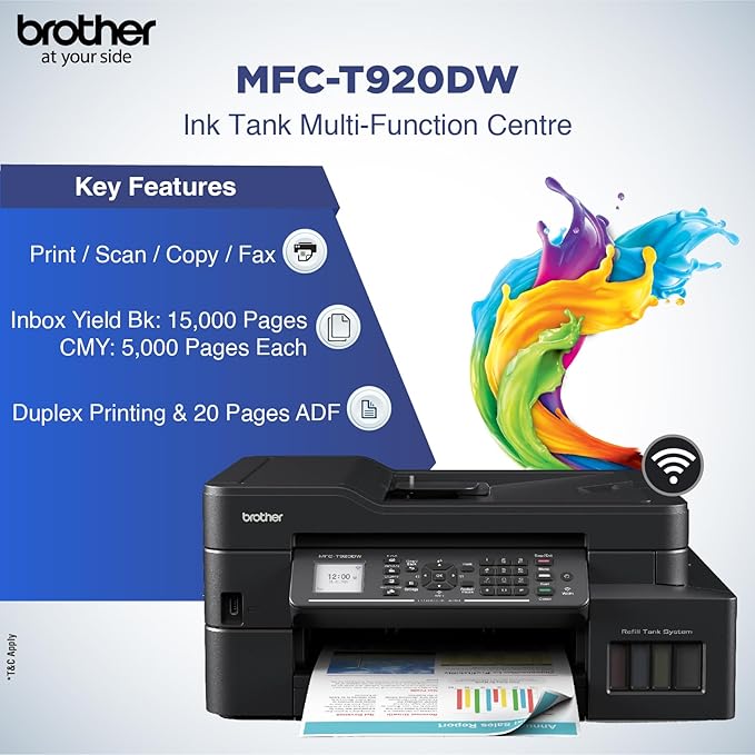 Brother MFC-T920DW Auto Duplex Printer is a versatile all-in-one device designed for high-volume printing, scanning, copying, and faxing. It features automatic duplex printing, allowing for efficient two-sided printing, which saves both time and paper. With an automatic document feeder (ADF), it simplifies the handling of multi-page documents. The printer supports various connectivity options, including WiFi, LAN, and USB, ensuring easy integration into any office environment. Capable of printing up to 15,000 pages in black and 5,000 pages in color, this printer is perfect for businesses that require cost-effective and reliable printing solutions.