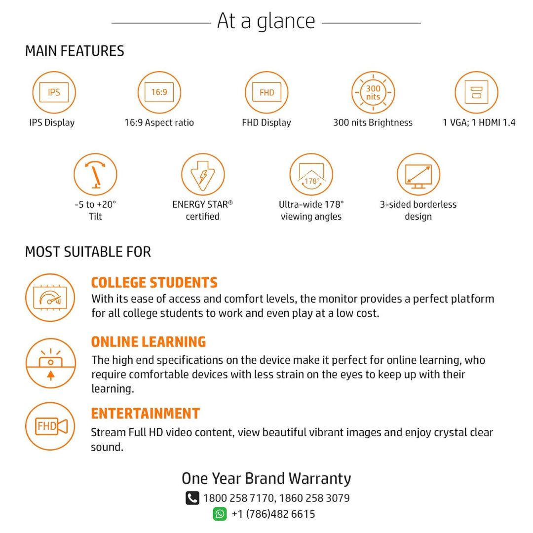 The HP V27i 27-Inch Full HD Monitor offers a perfect balance of size, clarity, and style for both home and office use. Featuring a 1920×1080 IPS panel, it delivers sharp visuals and wide viewing angles, ensuring consistent image quality from any direction. Its ultra-thin design with 3-side micro bezels enhances immersion and workspace aesthetics. With HDMI and VGA connectivity, the monitor easily connects to laptops, desktops, and media devices. Designed for comfort and reliability, the HP V27i includes Low Blue Light mode for reduced eye strain and supports VESA mounting for flexible setup options.