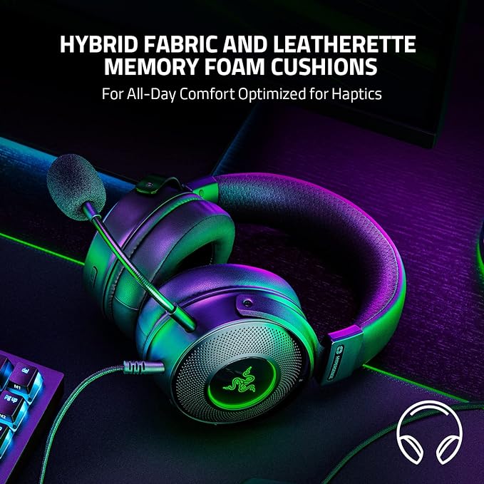 Immerse yourself in next-level realism with the Razer Kraken V3 Pro HyperSense Wireless Gaming Headset (RZ04-03460100-R3M1). Designed for ultimate immersion, it features Razer HyperSense haptic feedback, transforming sound into tactile sensations you can feel. Equipped with Razer TriForce Titanium 50mm drivers and THX Spatial Audio, it delivers superior clarity, detailed sound imaging, and deep, powerful bass. The Razer HyperSpeed Wireless connection ensures ultra-low latency audio, while the detachable HyperClear Supercardioid microphone guarantees crystal-clear voice transmission. The headset offers up to 44 hours of battery life, ensuring long, uninterrupted sessions. With its plush memory foam ear cushions, Chroma RGB lighting, and durable steel headband, the Kraken V3 Pro is built for both performance and comfort. Whether you’re gaming, streaming, or creating, the Kraken V3 Pro delivers premium wireless audio with an edge.