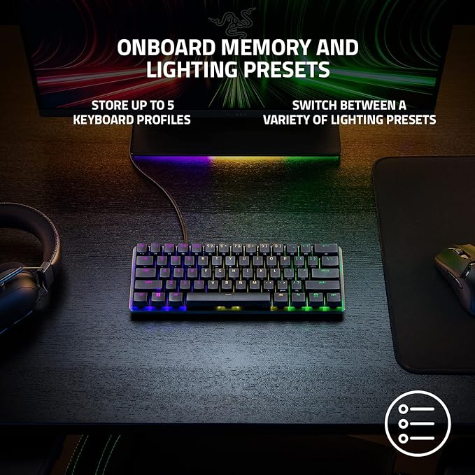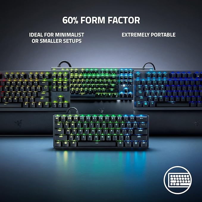 Its 60% form factor means no numpad, fewer bulky keys, and a slimmer layout that suits competitive gamers or minimal desk setups. The keyboard is built with doubleshot PBT keycaps for durability, and a metal top plate for enhanced stability. With Razer Chroma RGB lighting and onboard profile storage, you can customize your setup and take it on-the-go without reconfiguring each time.
