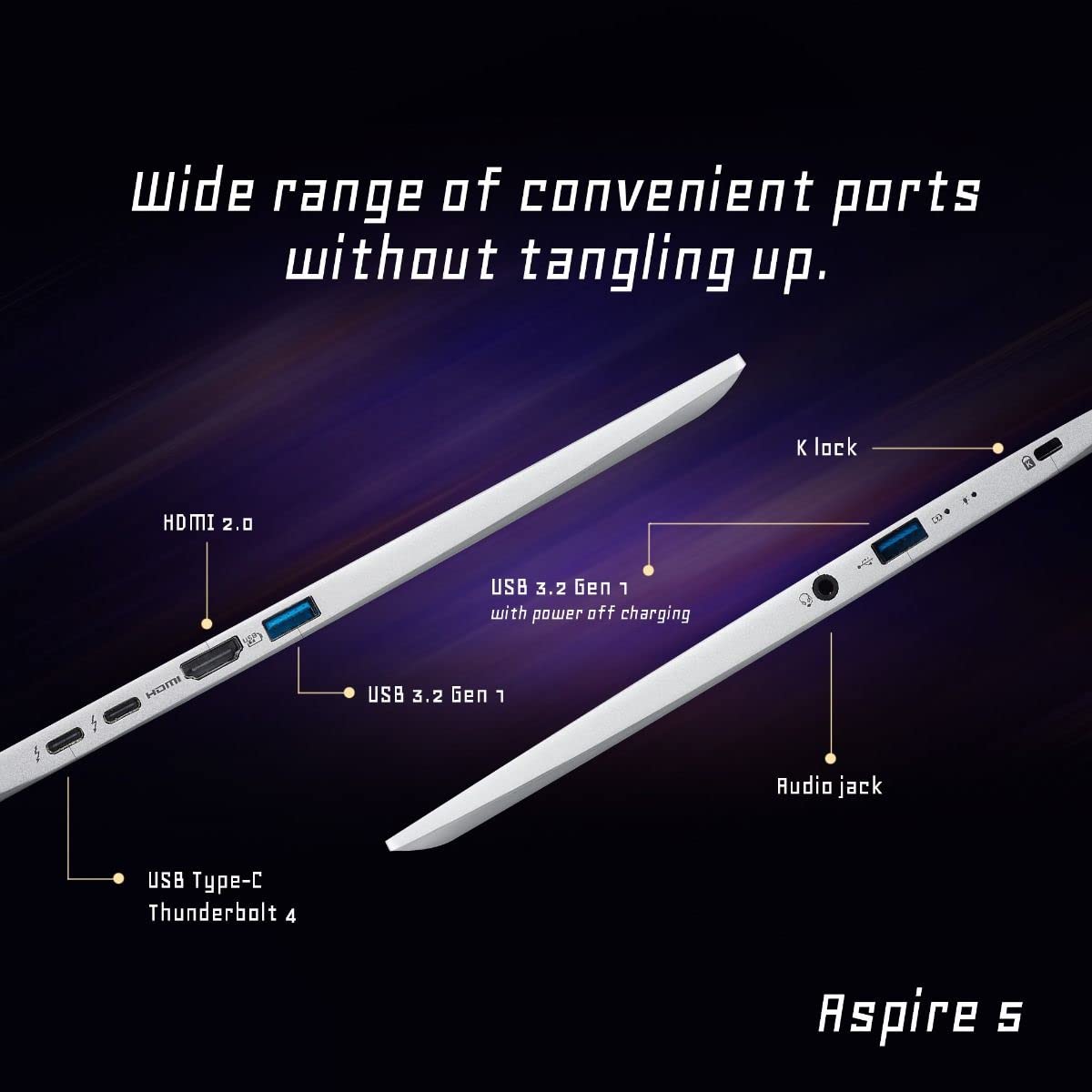 The Aspire 5 features a metal cover and an elevating hinge design with ergonomic features letting you play in your comfort. Now you can also take your game anywhere with the lightest gaming laptop