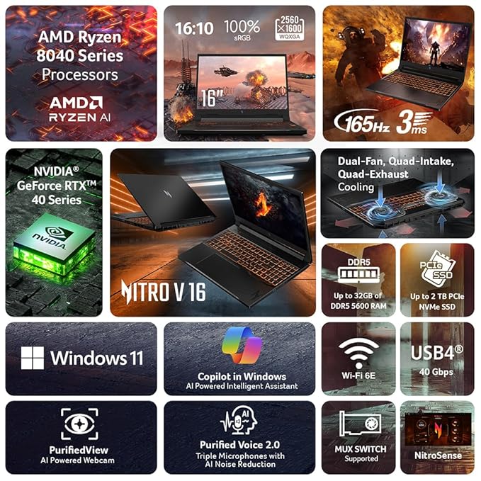 Sense on the Nitro V 16 allows you to easily control and monitor your laptop's performance. Adjust fan speeds, check system health, and optimize for gaming or other tasks with just a few clicks, maintaining peak performance and a cool system at all times.
