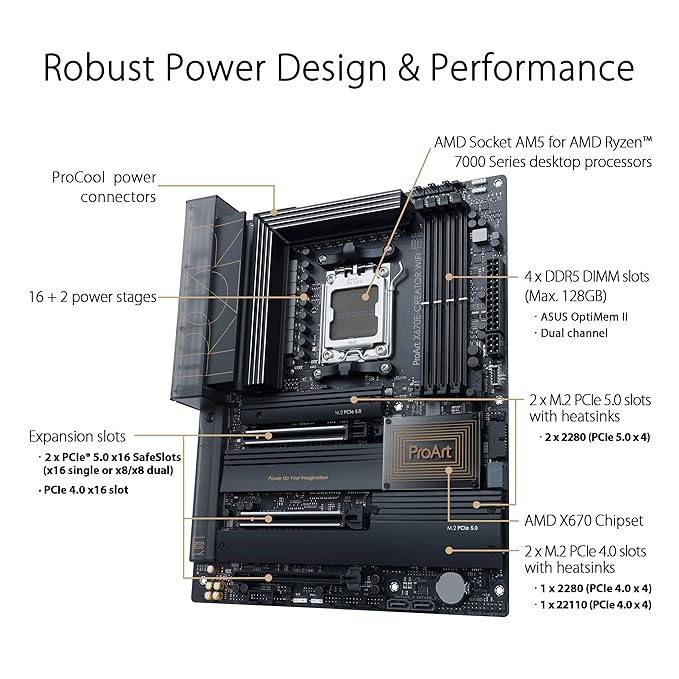 PCIe 5.0 supportFully embracing the new standard, the ProArt X670E-Creator WiFi offers PCIe 5.0 support to give unfettered bandwidth to the fastest SSDs and graphics cards available. Four onboard M.2 slots The ProArt X670E-Creator WiFi features four onboard M.2 slots, two of which are PCIe 5.0-ready to offer blistering 16 GB/s speed, while the remaining pair can still deliver massive 8 GB/s transfers through their PCIe 4.0 interfaces. |