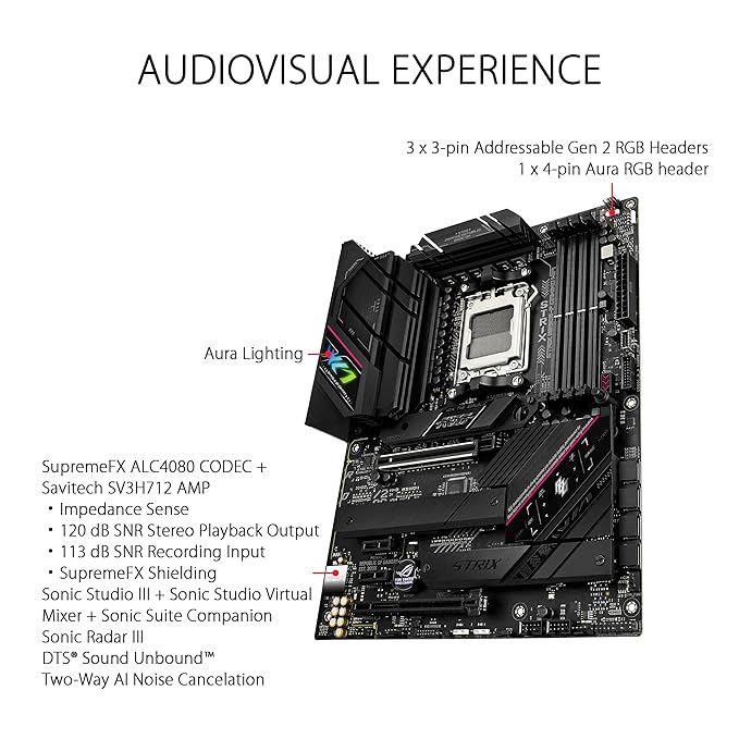 AUDIO - SUPREMEFXROG SupremeFX is a unique blend of hardware and software technologies that provide superior audio. The Strix B650E-F implementation features the ALC4080 codec for high-resolution playback up to 32-bit/384 kHz across all channels. Front-panel output is streamed through the integrated Savitech amplifier that can drive high-fidelity acoustics to a wide variety of speakers and headsets. |