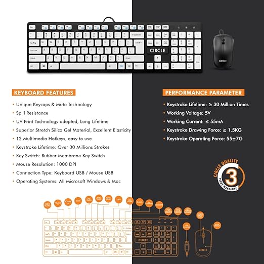 Circle Slim Multimedia C43 USB Keyboard Combo (White) is designed to offer a silent, stylish, and efficient typing experience. Built with mute key technology and spill-resistant features, it ensures durability and comfort in everyday use. With 12 easy-access multimedia hotkeys, you can control music, video, volume, and more at your fingertips. Its sleek white design complements modern workspaces while its plug-and-play USB setup makes it easy to use right out of the box. Ideal for both home and office environments.