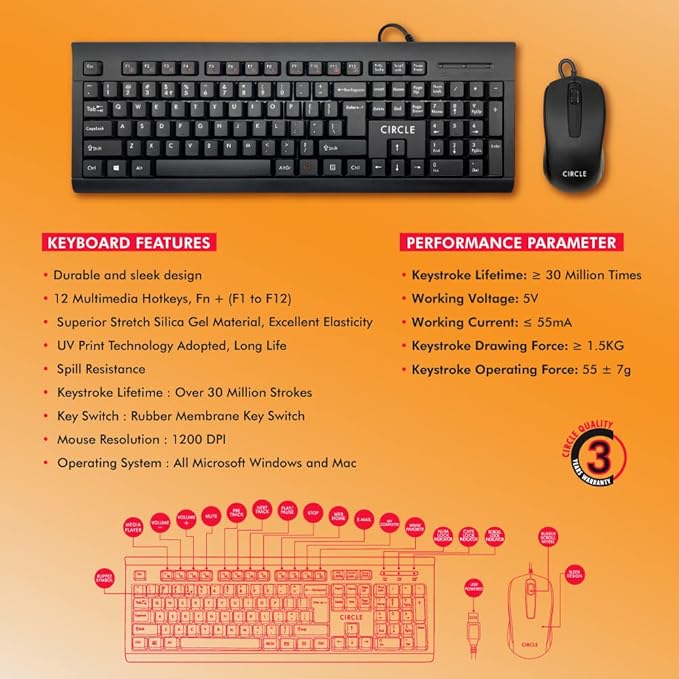 Circle C41 Multimedia USB Keyboard Combo is designed for efficiency, durability, and comfort. With a sleek and ergonomic design, this keyboard is ideal for home, office, and multimedia usage. It features 12 dedicated multimedia hotkeys for seamless control over music, videos, and other applications.