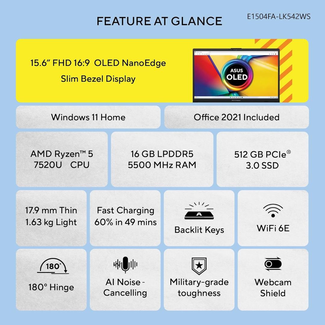 The ASUS Vivobook Go 15 OLED is designed to deliver power, style, and efficiency for students and professionals alike. Powered by the latest AMD Ryzen 5 7520U (7000 Series) processor and 16GB DDR5 RAM, it ensures seamless performance whether you’re studying, multitasking, or streaming content.