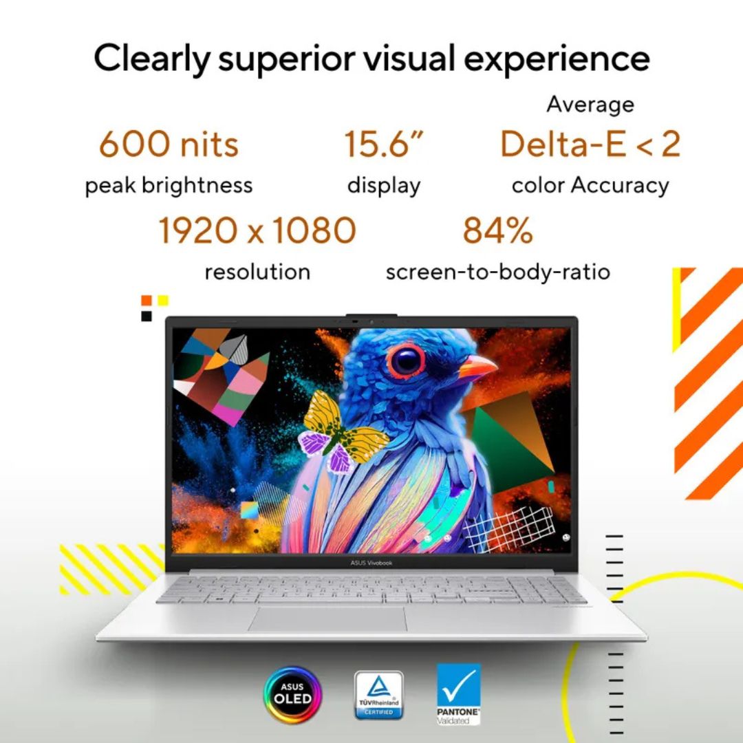 Vivobook Go 15 OLED has stunningly crisp and clear visuals, with a reduced risk of eye strain during long viewing sessions thanks to its TÜV Rheinland eye-care certified OLED panel. The NanoEdge slim-bezel design gives you more screen space for multitasking and immersive viewing.