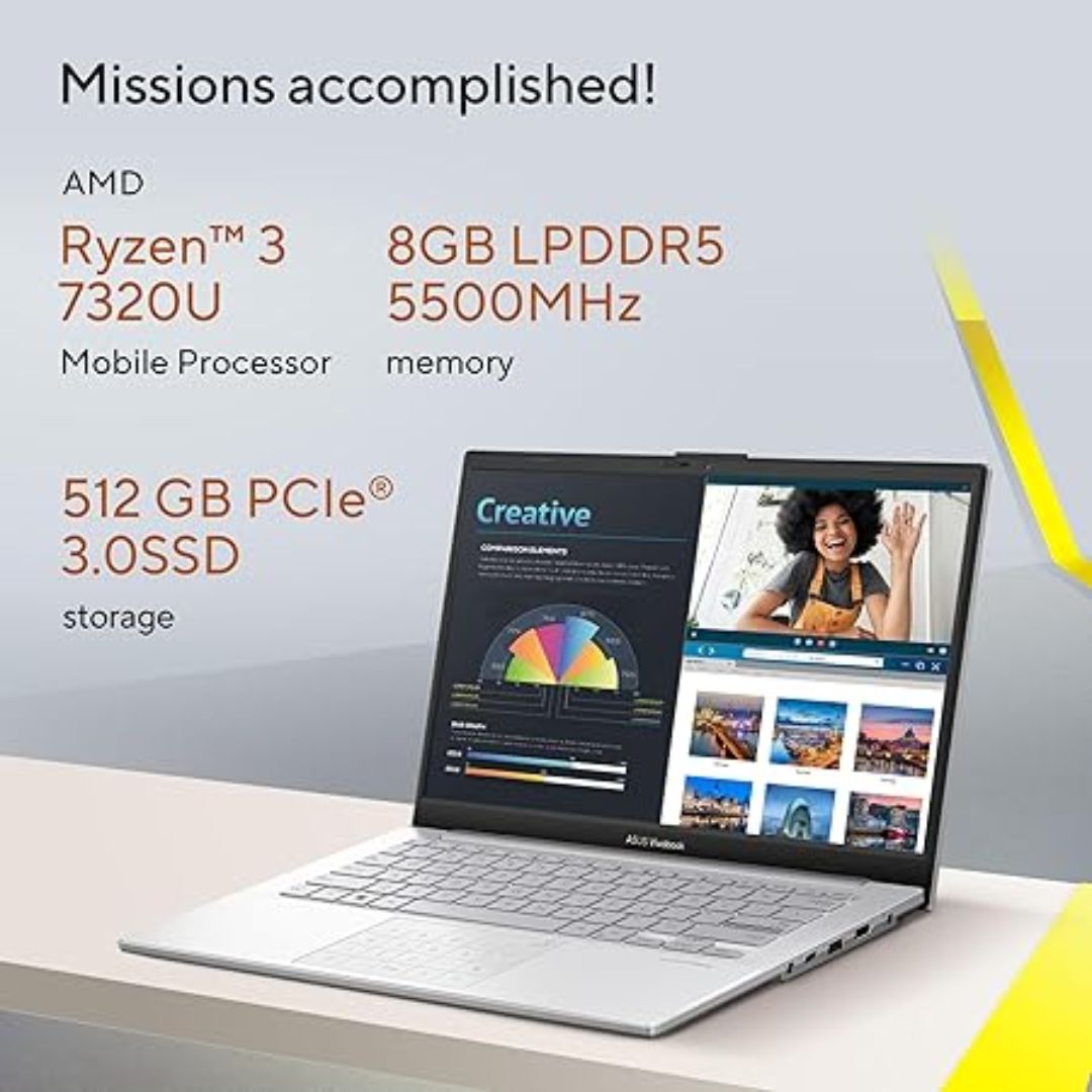 Vivobook Go 14 is powered by an AMD Ryzen 7000-U Series processor, LPDDR5 memory, and PCIe SSD storage to help you complete all your productivity missions