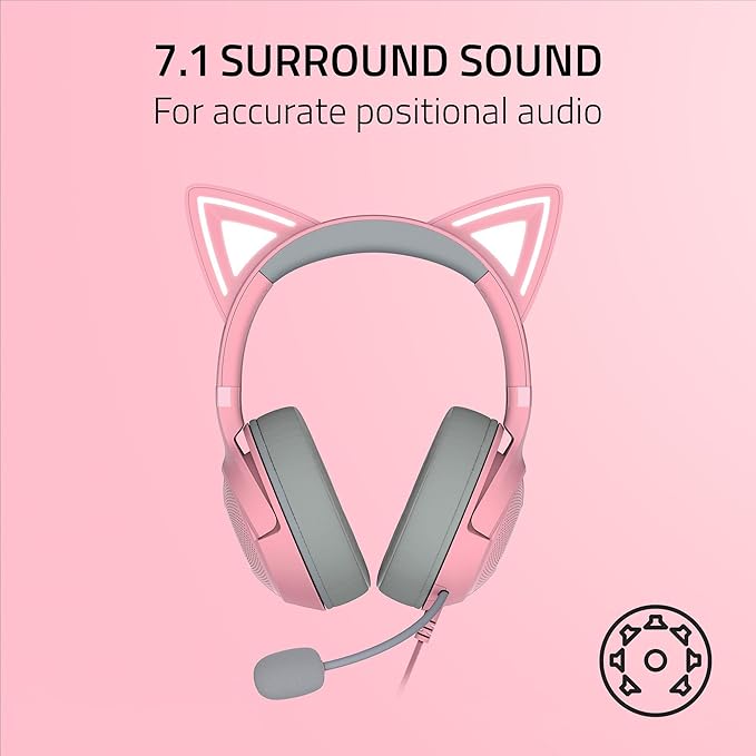 The Razer Kraken Kitty V2 Wired RGB Headset (RZ04-04730200-R3M1) in Quartz Pink combines adorable style with professional-grade performance. Designed for streamers, gamers, and content creators, it features Razer’s iconic kitty ears with Chroma RGB lighting that reacts to audience interactions and music. Equipped with Razer TriForce 40 mm drivers, this headset delivers clear highs, powerful lows, and rich midrange sound, ensuring an immersive gaming experience. The HyperClear Cardioid microphone captures your voice with superior accuracy while minimizing background noise. Enjoy the benefits of 7.1 surround sound on PC for precise audio positioning, ideal for both competitive and casual gaming. With its lightweight build, soft memory foam cushions, and stunning Quartz finish, the Kraken Kitty V2 is the perfect blend of comfort, performance, and personality for any gamer.