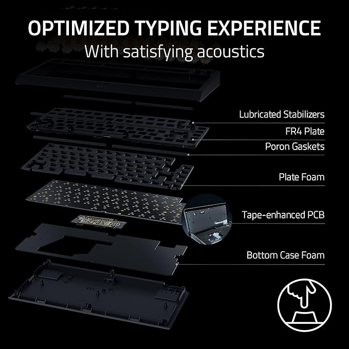 Featuring a gasket-mounted FR4 plate, tape-enhanced PCB, lubricated stabilizers, and two layers of sound dampening foam, enjoy light, balanced keystrokes that sound full and satisfying.