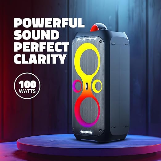 A: It delivers an impressive 100W RMS output, offering loud, rich, and deep sound suitable for large spaces and events.