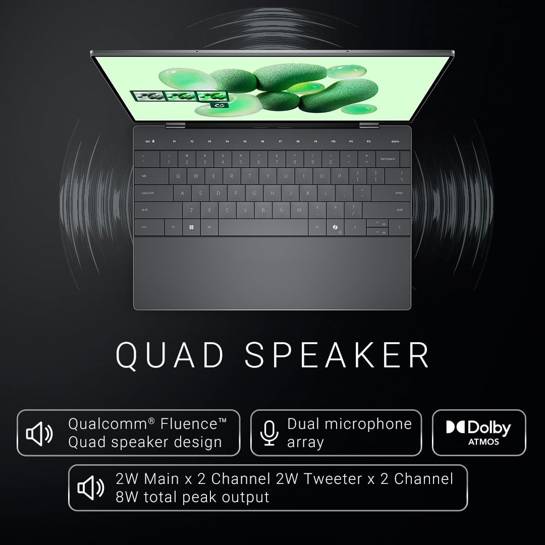 [1] Based on internal analysis, June 2024.[2] Based on Dell analysis, April 2024.[3] Netflix streaming battery benchmark: XPS 13 tested with Snapdragon X1 Elite X1E-80-100, FHD+ display, 16GB, 512GB SSD. Testing conducted by Dell labs in May 2024 with display brightness set to 150 nits (40%) and wireless enabled. Based on streaming Netflix 1080p content using the Netflix Windows 11 app. Actual battery life may be significantly less than the test results and varies depending on product configuration and use, software, usage, operating conditions, power management settings and other factors. Maximum battery life will decrease with time. The stated Watt Hour (WHr) is not an indication of battery life. [4] Based on internal analysis, June 2024. Based on EPEAT Climate+ Designations achieved in all applicable countries. EPEAT registered where applicable.EPEAT registration varies by country. See www.epeat.net for registration status and tier levels by country.[5] Based on May 2024 Stratetgic Thermal Lab report commissioned by Dell Technologies using Cinebench 2024 Multi-Core, 10-minute-stress test - April 2024 comparing Internal Test Data with XPS 13, Qualcomm Snapdragon X Elite - X1E80100, Qualcomm Adreno graphics, 64GB memory, 2TB SSD vs. MacBook Air 13, M3 8-core CPU, 10-core GPU, 16GB memory, 512GB SSD.[6] Cocreator is optimized for English text prompts. Requires Microsoft account.[7] Based on third party analysis, June 2024.