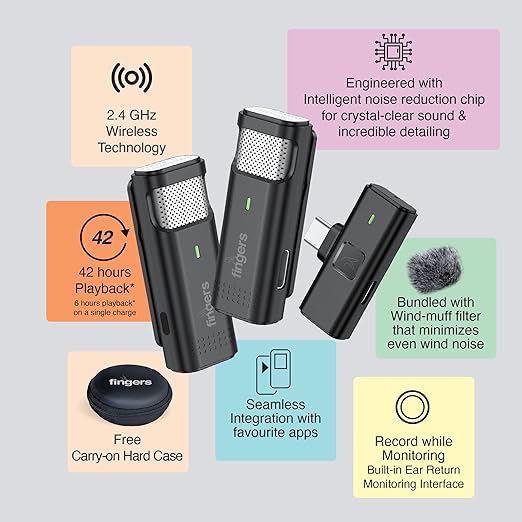 | Box Contents | 1 x Brand Note, 1 x FINGERS Duo-PhoneMic-TypeC (2 x Mics + 1 x Receiver + Charging Dock with Type-C), 1 x USB Type-C cable, 2 x Wind-muff Filter |