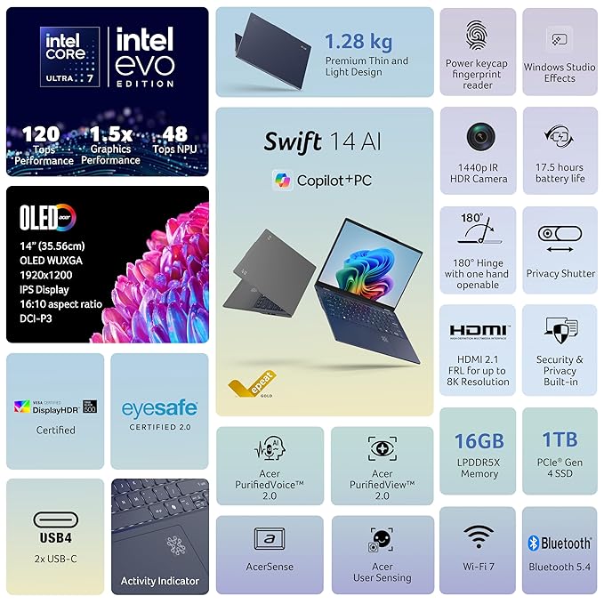 Sleek, stylish, and smart, Swift 14 AI features an ultra-thin design that easily slips into your bag and weighs as little as 1.26 kg. It's screen opens a full 180 degrees, perfectly adapting to any work style