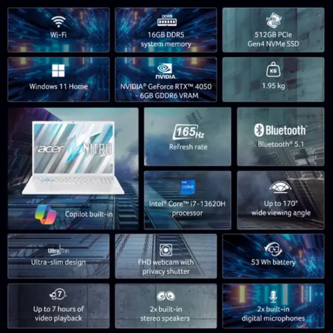 The Acer Nitro Lite 16 (NL16-71G) with Intel Core i7-13620H and NVIDIA GeForce RTX 3050 (6GB GDDR6) delivers a powerful gaming and productivity experience in a lightweight, stylish design.