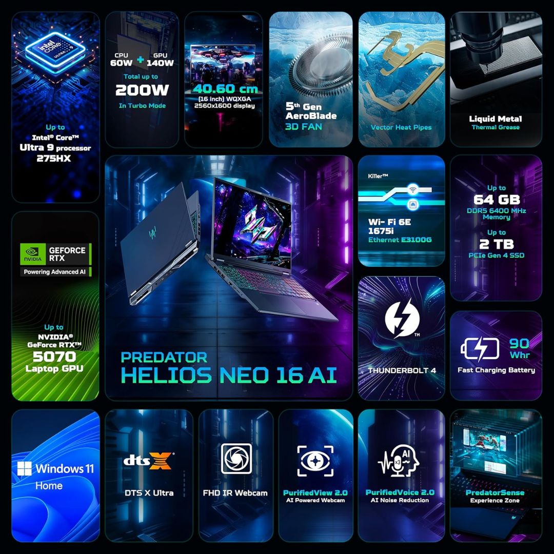 Acer Predator Helios Neo 16 (PHN16-73) NH.QX3SI.001 is a powerhouse designed for serious gamers, creators, and AI-driven workloads. Featuring the Intel Core Ultra 9 processor, it delivers lightning-fast speed, multitasking efficiency, and AI-boosted performance.