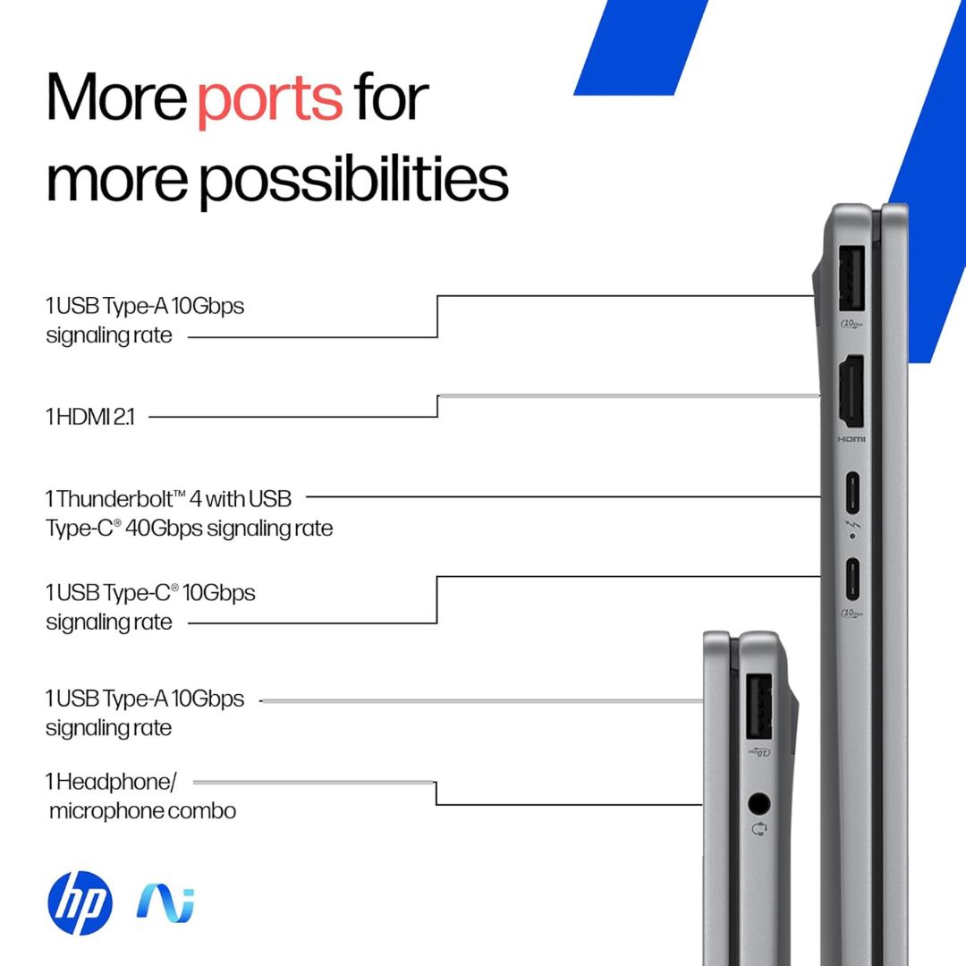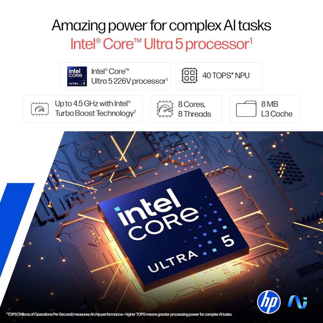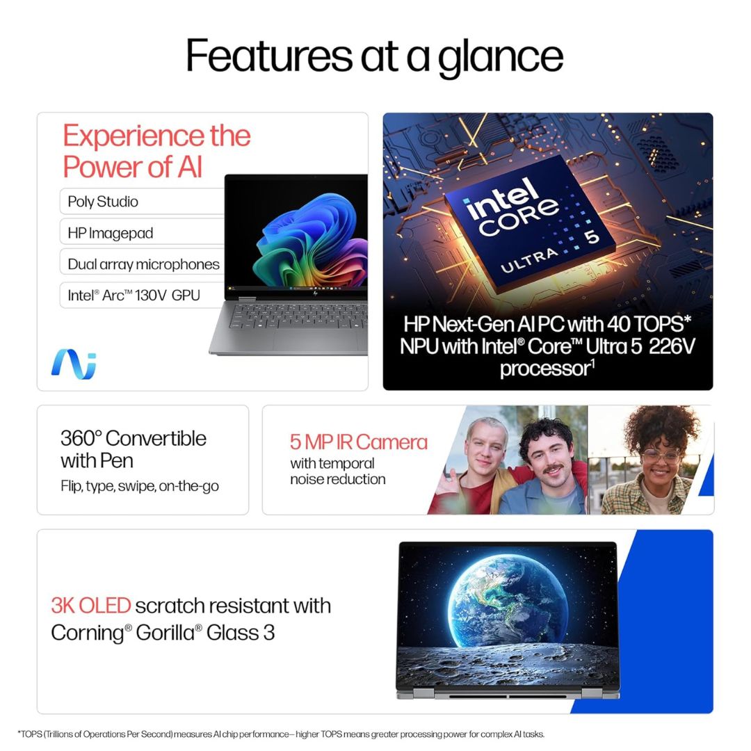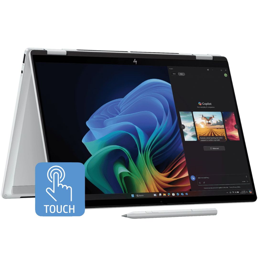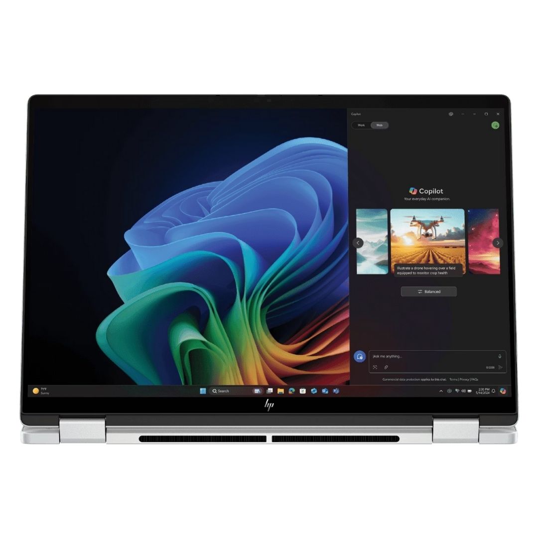 The HP OmniBook X Flip OLED (fm0099TU), a refined evolution of the Envy series, is a cutting-edge 2-in-1 AI laptop built for professionals and creators. Powered by the Intel Core Ultra 5 226V processor with 40 TOPS AI capability, it delivers smart, efficient, and adaptive computing. The immersive 14-inch 3K OLED touchscreen, featuring a 120Hz refresh rate, ensures breathtaking visuals with rich contrast and lifelike colors. Designed for flexibility, the convertible form allows seamless transition between laptop and tablet modes. Crafted from premium aluminum in a sleek silver finish, it weighs only 1.38kg for on-the-go convenience. With 16GB LPDDR5X RAM, 1TB SSD storage, Windows 11, and Office 2024 preinstalled, the OmniBook X Flip OLED is engineered for those who demand performance, versatility, and elegance in a next-generation AI laptop.