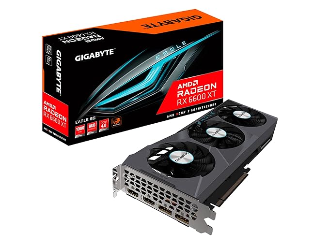 Powered by AMD RDNA 2 Radeon RX 6600XT Integrated with 8GB GDDR6 128-bit memory interface WINDFORCE 3X Cooling System with alternate spinning fans Screen Cooling 2x DisplayPort 1.4a 2x HDMI 2.1 Graphene nano lubricant RGB Fusion 2.0 Protection metal backplate. GIGABYTE AMD Radeon RX 6600 XT EAGLE 8G graphics card delivers ultra-high frame rates and serious 4K gameplay. Get the ultimate gaming experience with powerful new compute units, amazing AMD Infinity Cache, and up to 8GB of dedicated GDDR6 memory. And, when paired with an AMD Ryzen Series desktop processor, AMD Smart Access Memory technology offers new levels of gaming performance.