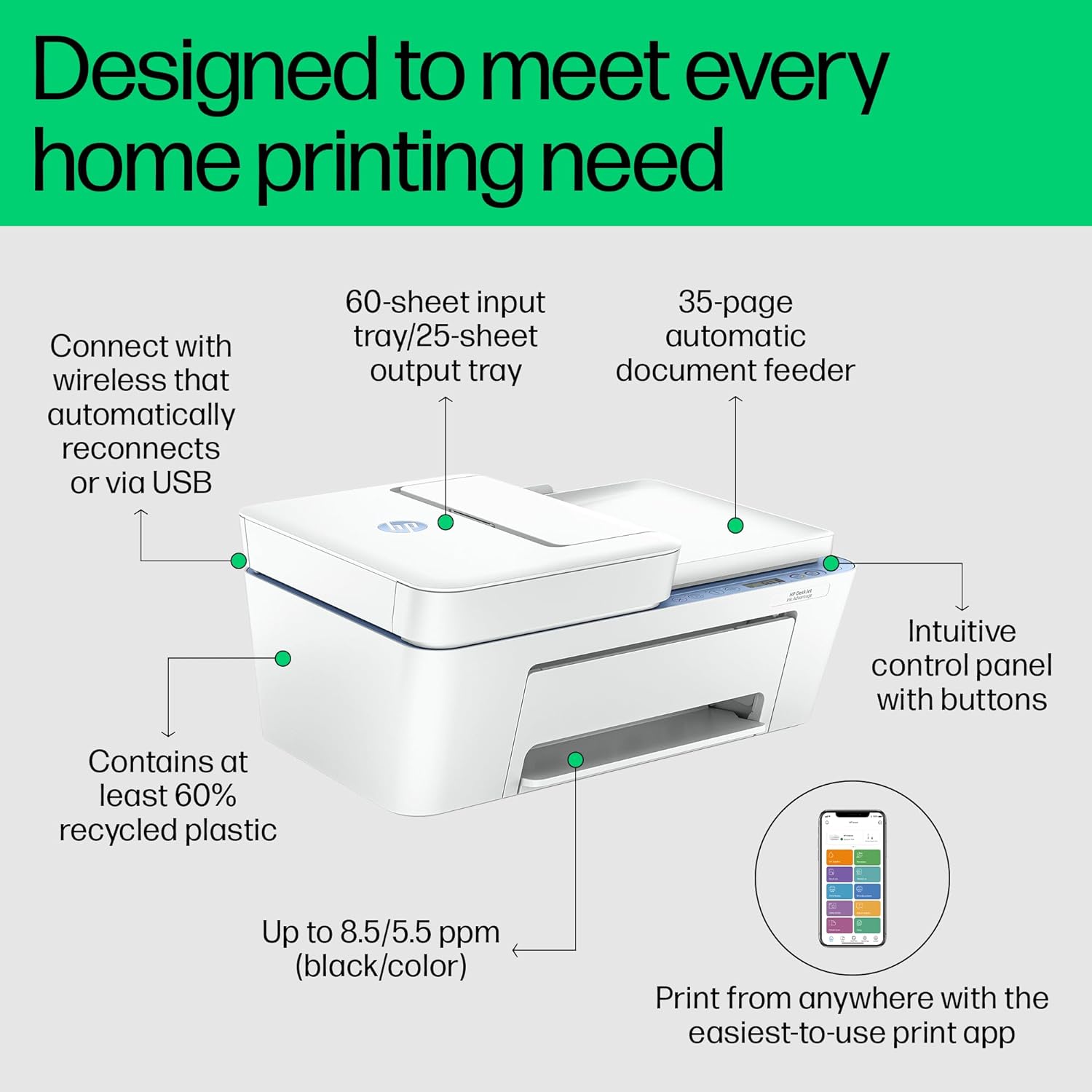 The HP Ink Advantage 4278 All-in-One Printer is designed for home use, offering a complete solution for your printing, copying, and scanning needs. Featuring an Automatic Document Feeder (ADF), this versatile printer streamlines multi-page document handling. With Wi-Fi, Bluetooth, and USB connectivity, you can easily print from any device. The Smart App setup ensures a hassle-free installation process, allowing you to start printing in no time. Ideal for home offices, the HP Ink Advantage 4278 delivers high-quality prints with exceptional efficiency and convenience. Enjoy reliable performance and seamless integration with your mobile devices for a truly connected printing experience.