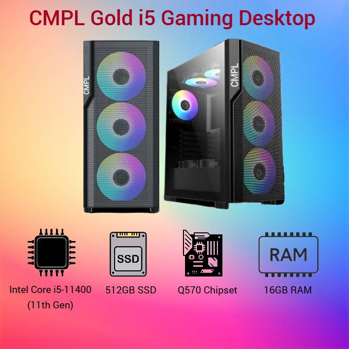CMPL Gold Gaming Desktop, designed for gamers, professionals, and multitaskers. Powered by an 11th Gen Intel Core i5-11400 processor and paired with 16GB DDR4 RAM, this PC handles demanding applications, multitasking, and gaming with ease. A fast 512GB SSD ensures quick boot times and responsive performance, while the 4GB dedicated graphics card delivers smooth visuals for gaming and creative tasks.