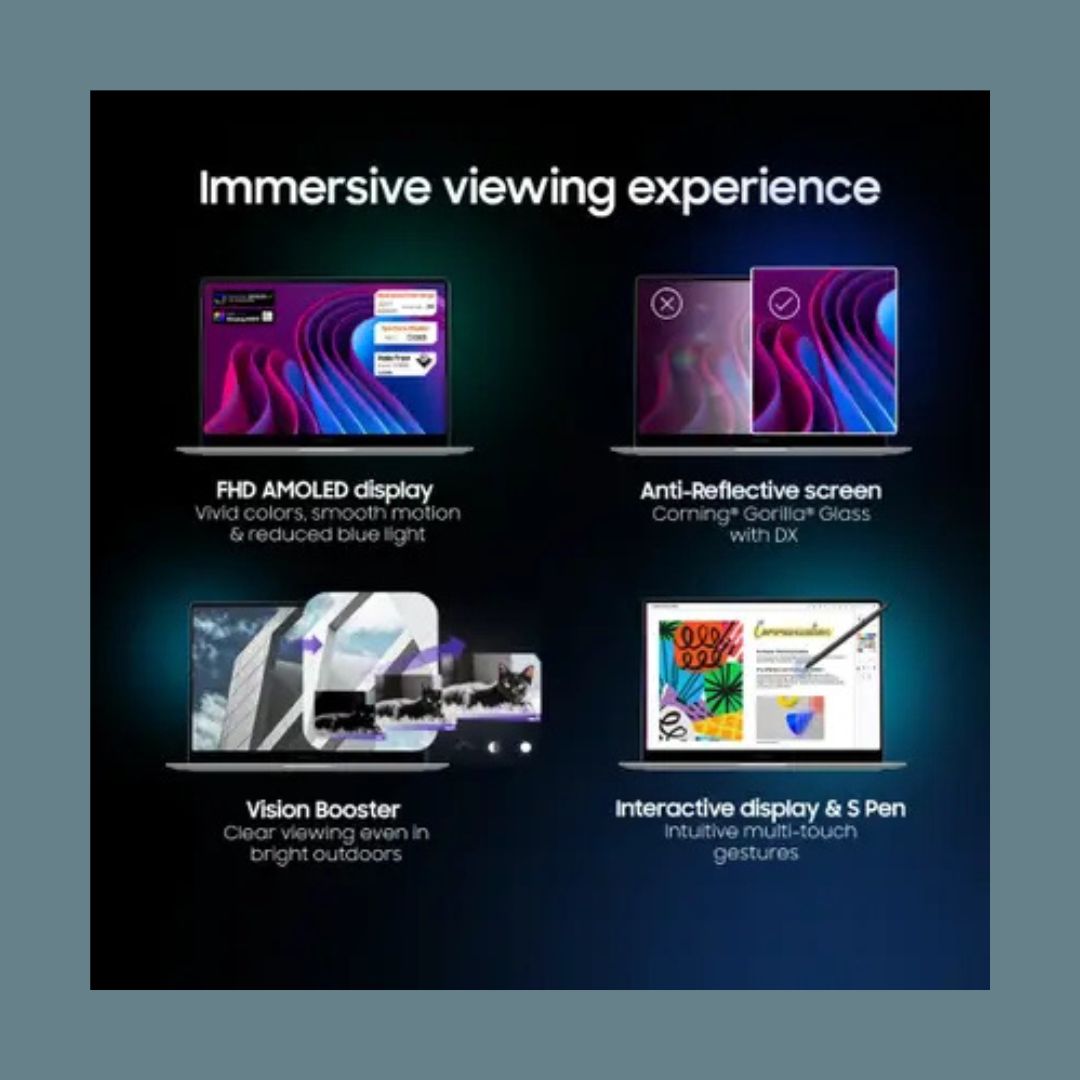 Its 15.6-inch AMOLED touchscreen delivers stunning visuals with deep blacks and rich colors, making it ideal for creative tasks, presentations, and entertainment. The 360-degree hinge allows seamless switching between laptop and tablet modes, while S Pen support enhances precision for note-taking and design work. Crafted with a sleek metal body and weighing just 1.48 kg, it combines portability with durability. Features such as a backlit keyboard, fingerprint reader, Windows 11 Home, and MS Office make it a complete high-end productivity solution.