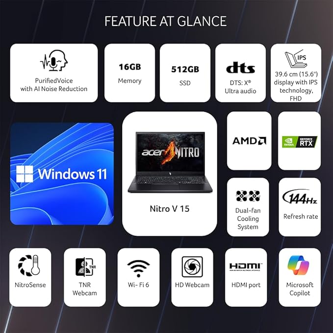 NitroSense on the Nitro V 15 allows you to easily control and monitor your laptop's performance. Adjust fan speeds, check system health, and optimize for gaming or other tasks with just a few clicks, maintaining peak performance and a cool system at all times.