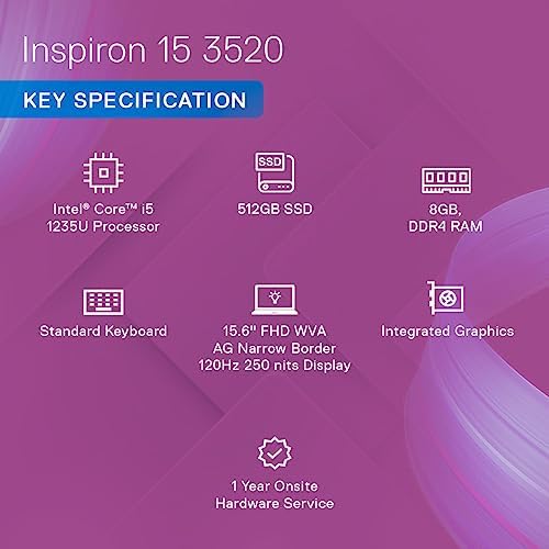 ►Experience powerful performance and sleek design with the Dell Inspiron 3520 Laptop. Equipped with the Intel Core 12th Gen i5-1235U Processor, 8GB RAM, and a spacious 512GB SSD, it ensures smooth multitasking and ample storage for your files. The 15.6" Full HD Anti-Glare display with a 120Hz refresh rate and 250 nits brightness delivers crisp visuals, ideal for work or entertainment. Running on Windows 11 and preloaded with MS Office 2021, it offers productivity right out of the box. Additional features include a backlit keyboard for enhanced typing in any environment, McAfee antivirus for 15 months, all in a lightweight and portable design weighing just 1.82kg. Ideal for both business and personal use, the Dell Inspiron 3520 is your perfect companion for on-the-go computing.