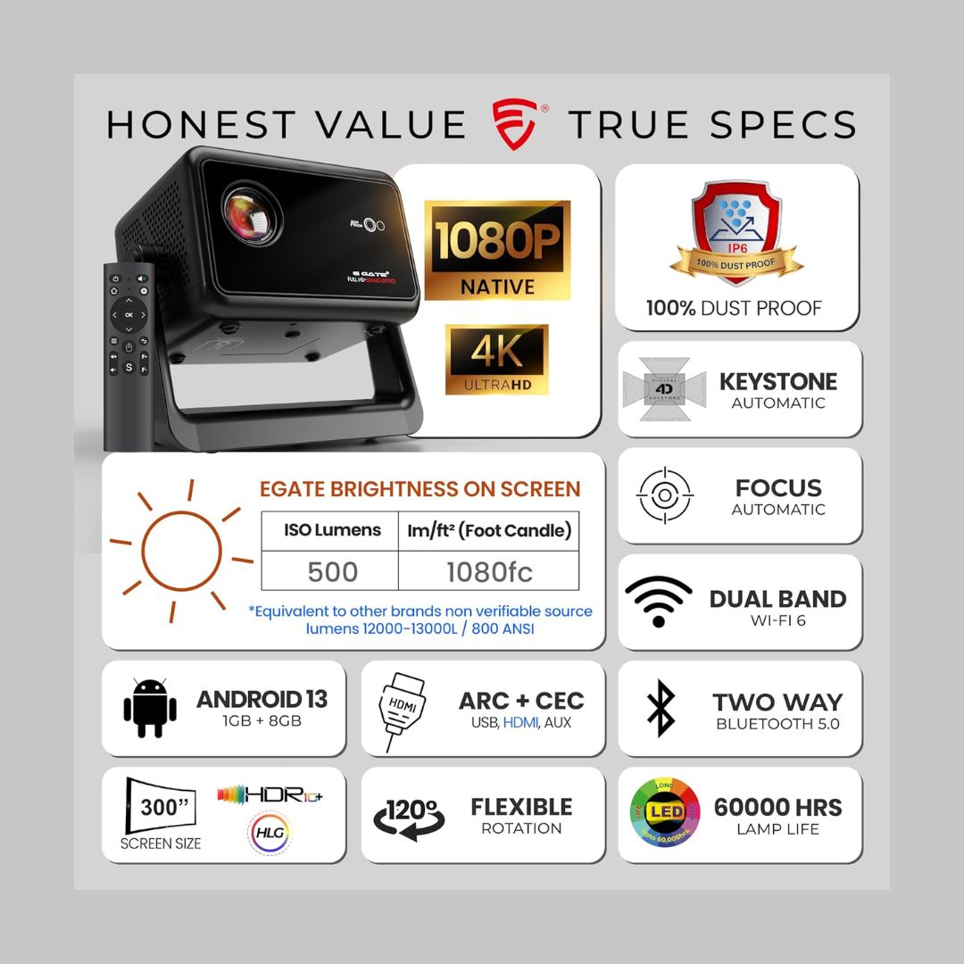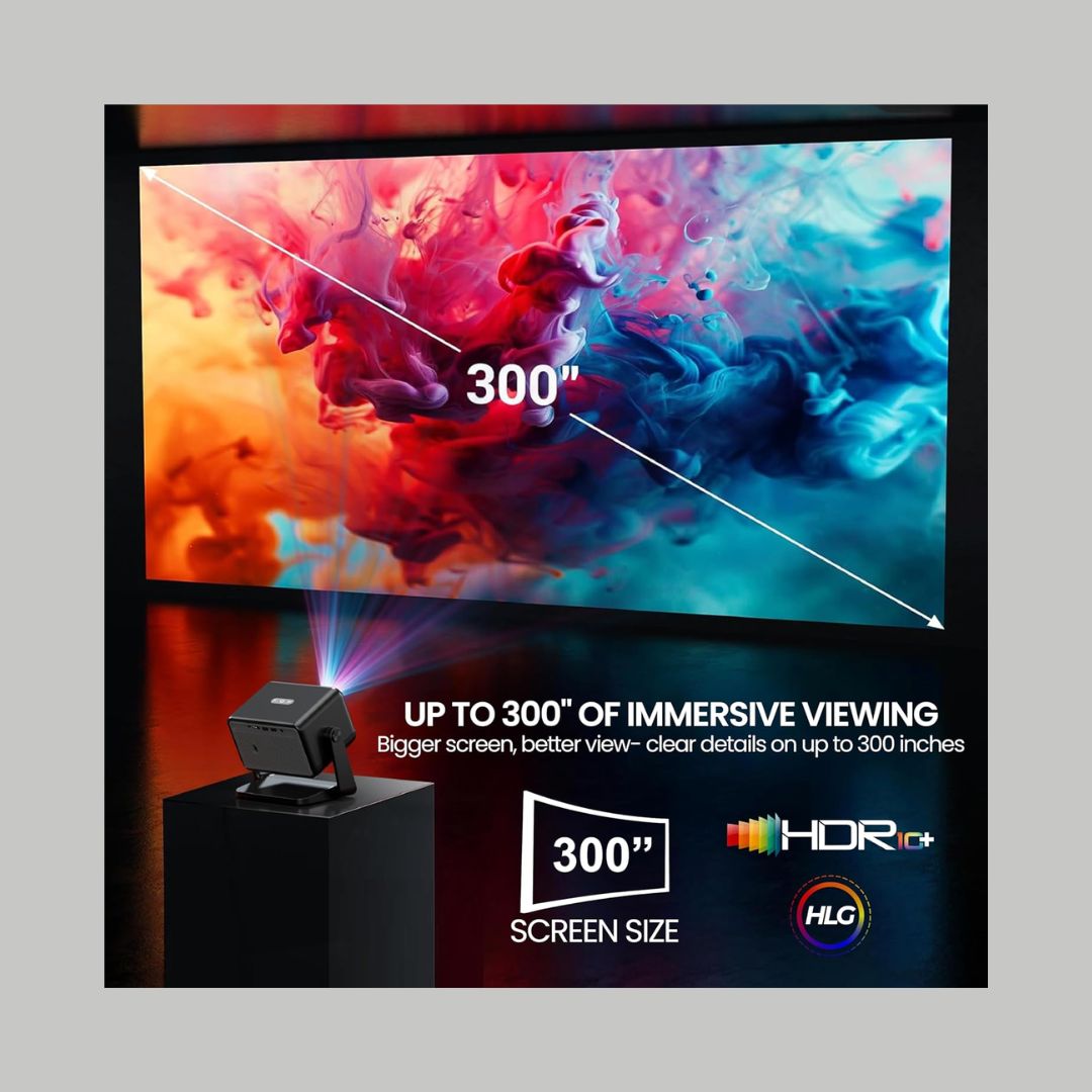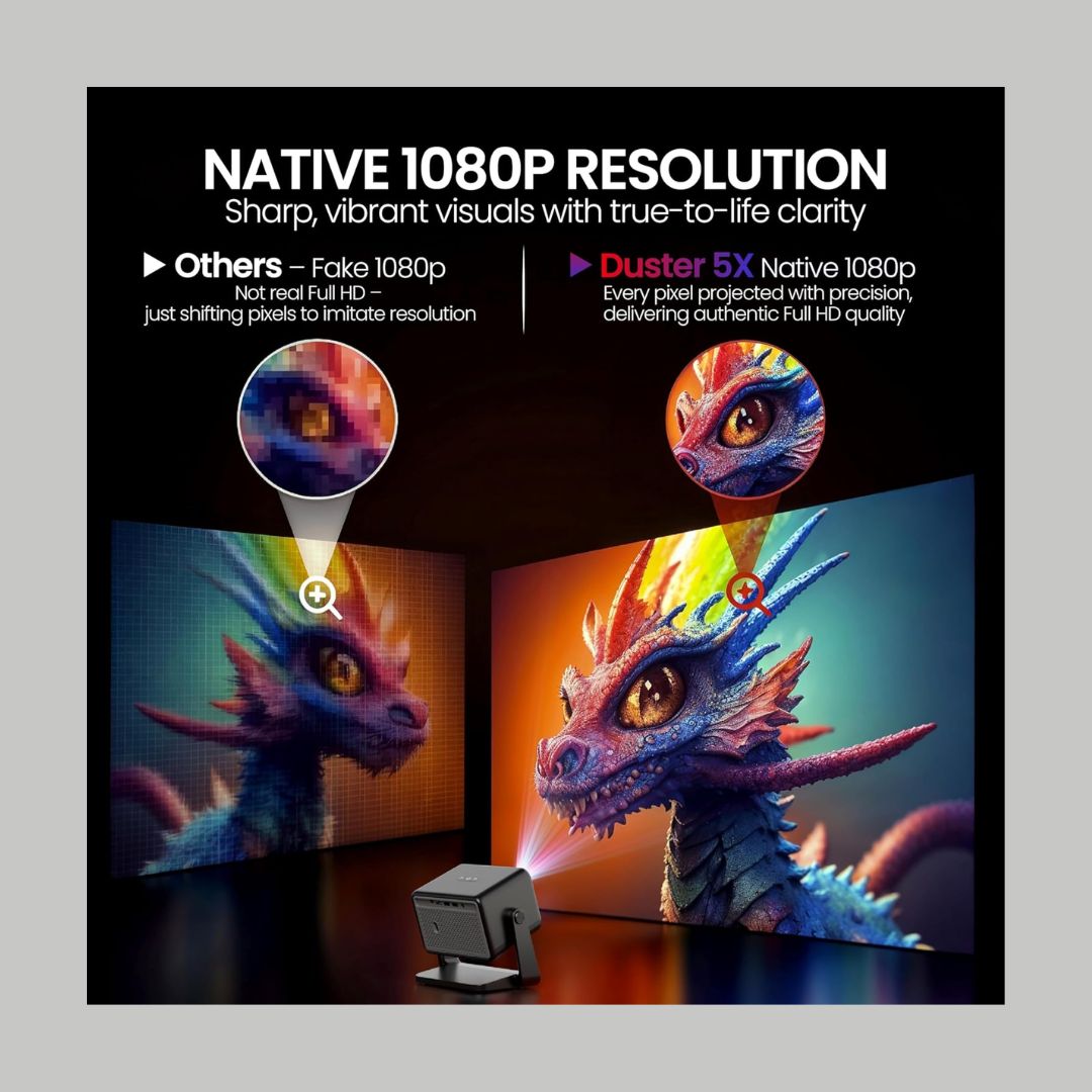 The E Gate Duster 5X Fully Automatic Projector delivers a premium home theater experience with vibrant visuals, smart features, and effortless setup. Featuring a native 1080p resolution with 4K Ultra HD support and a 500 ISO lumens brightness, it produces bright, clear, and detailed images that bring movies, games, and shows to life.