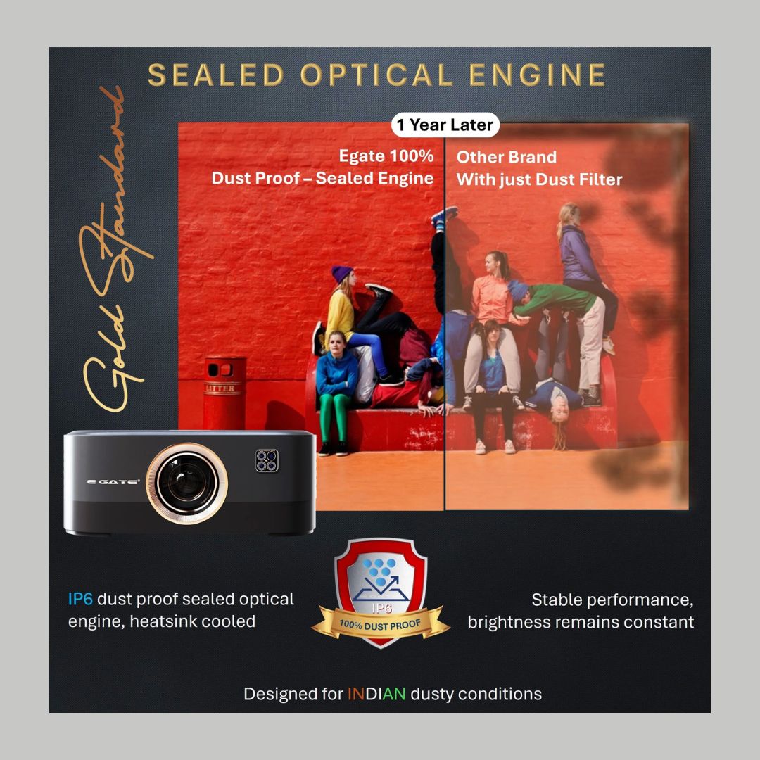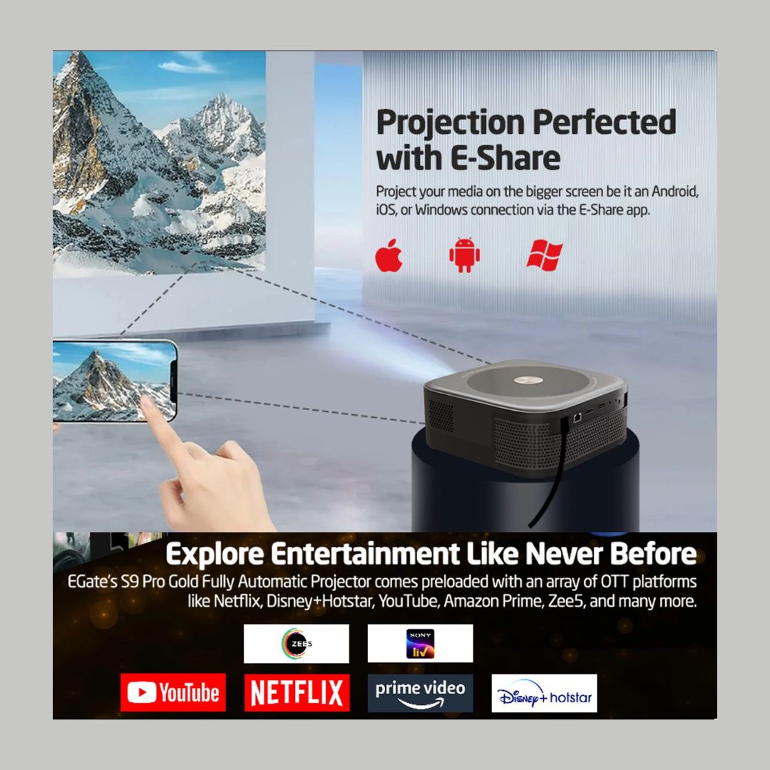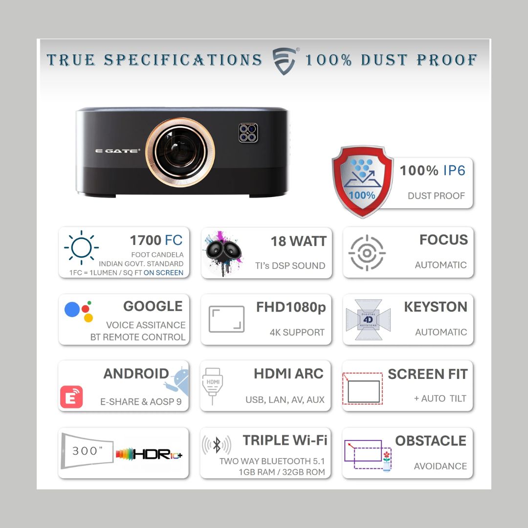 The E Gate Duster 8X Smart Projector is engineered to deliver an immersive big-screen experience with advanced automation and powerful brightness. Featuring a native Full HD 1080p resolution and support for 4K content, it produces sharp, vibrant visuals suitable for movies, gaming, and presentations.