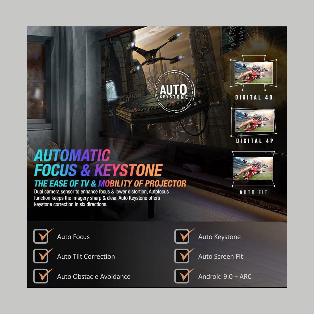 The Duster 8X offers fully automatic focus and keystone correction, along with obstacle avoidance and screen fit technology, ensuring a perfectly aligned image every time. Smart connectivity options like triple-band WiFi, Bluetooth 5.1 (in & out), HDMI ARC, and E-Share wireless display make content sharing seamless and convenient.