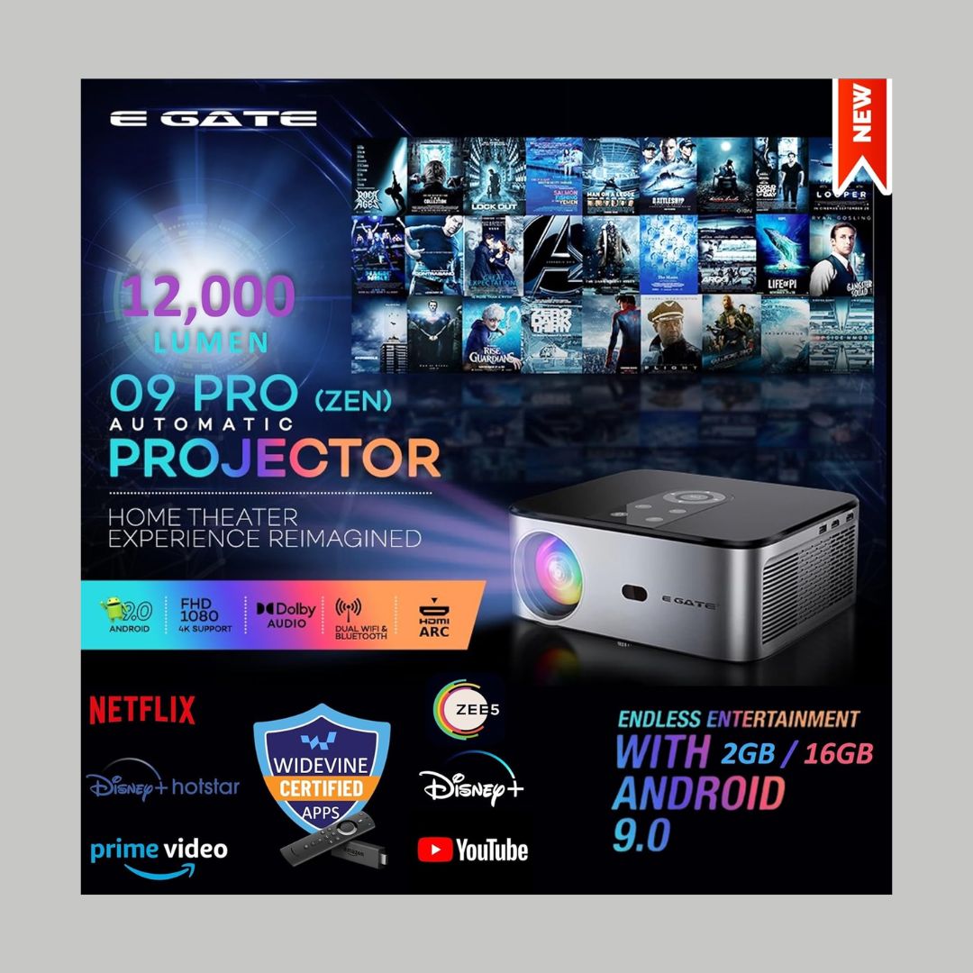 The EGate O9 Pro-Zen Smart Projector is a powerful home entertainment solution built for seamless streaming and immersive visuals. Featuring a Dual OS system (Android + FTS), it ensures stable performance while delivering certified access to Netflix, Prime Video, Hotstar, and other popular OTT platforms.