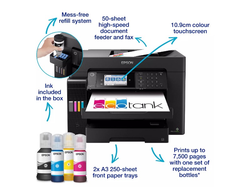 | Top Features | - Fast colour print speed of up to 25.0 ipm (Simplex) - Prints up to A3+ (for simplex) - Automatic duplex printing - Ultra-high page yield of 7,500 pages (black) and 6,000 pages (colour) - Wi-Fi, Wi-Fi Direct, Ethernet - Epson Connect (iPrint, Email Print, Remote Print Driver, Scan to Cloud) |