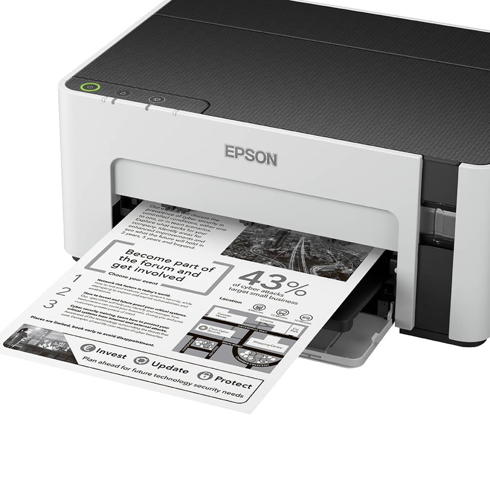 Busy offices with high print volume will appreciate the fast print speeds of 32ppm for draft and 15ipm for standard prints on the EcoTank M1100. The M1100 uses genuine pigment ink which allows you to print sharp texts that are water- and smudge-resistant. You can enjoy low printing costs without sacrificing the quality of your printouts.